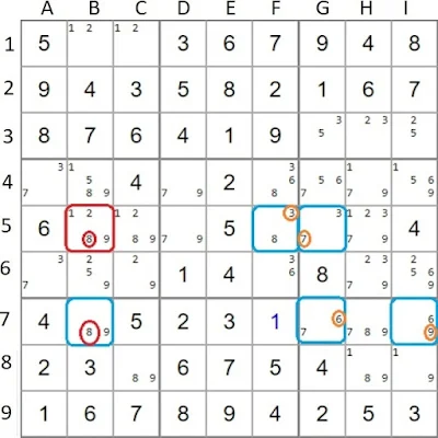 Para llegar hasta aquí no presenta grandes complicaciones salvo un par de descartes basados en parejas desnudas, es hora de las cadenas forzadas, esta la vamos a evaluar desde las casillas G4 y H4 (las rojas) ya que las dos se pueden combinar de igual forma con las azules, y se puede ver que con los dos 3s hay contradicciones, los eliminamos.