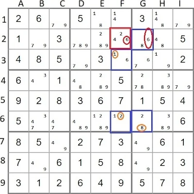 Como no vemos nada seguimos con los descartes, una cadena forzada bidireccional nos alerta de que F6 no puede ser cuatro, esto deja otro cuatro para quitar.